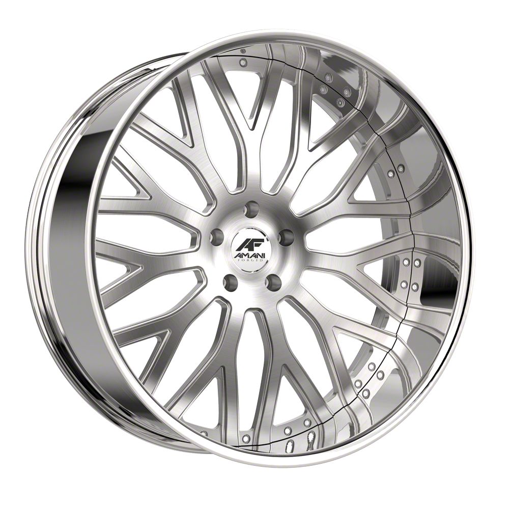 This 28x10 Amani Sorleno Brush Center with Chrome Lip Wheel; 28x10; 5mm Offset is completed in a high-quality brushed finish with a chrome lip to make your wheel the envy of everyone. For added looks and durability, the wheels has a durable clear coat that withstand the rigors of daily driving.