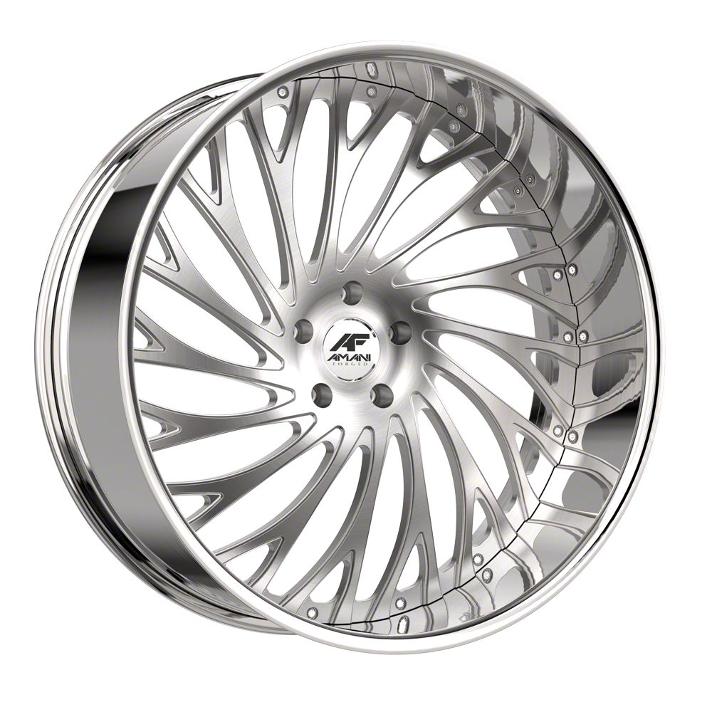 This 28x9 Amani Vamos-L Brush Center with Chrome Lip Wheel; 28x9; 1mm Offset is completed in a high-quality brushed finish with a chrome lip to make your wheel the envy of everyone. For added looks and durability, the wheels has a durable clear coat that withstand the rigors of daily driving.