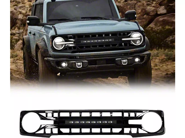 _x000D_Equipped with LED Off-Road Lights: With LED Off-Road Lights help go over any off-roading trail. If you want an unique look and well-constructed grille for your bronco, the glossy black grille with LED off-road lights is a perfect choice.