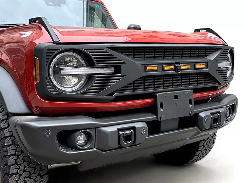 Application. This American Modified Tomahawk Grille with Amber Lights; Matte Black is designed to fit 2021-2026 Ford Bronco models. This is a replacement grille not an overlay.