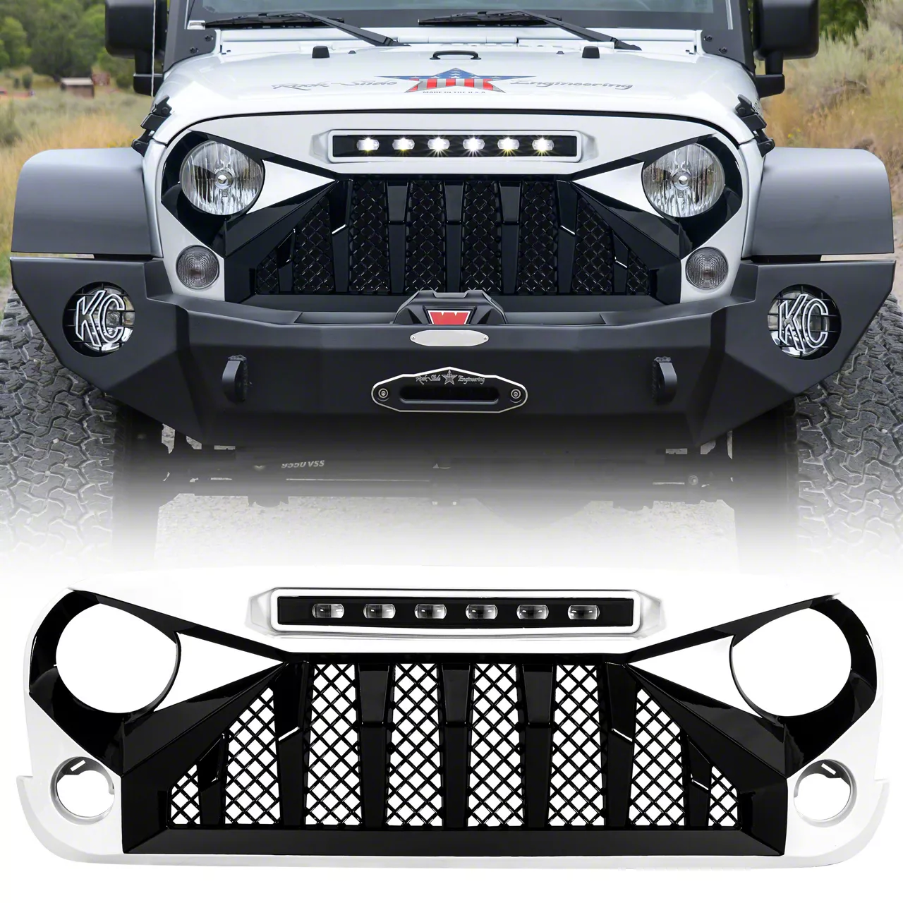 Durable and Purpose-Built. Crafted from high-quality materials, this grille is designed to withstand tough off-road conditions while providing long-term durability. Its rugged white and black finish ensures resistance to scratches and corrosion, maintaining its bold appearance over time. With its precise fit and robust design, this grille offers exceptional front-end protection and complements your Jeep’s off-road-ready look.