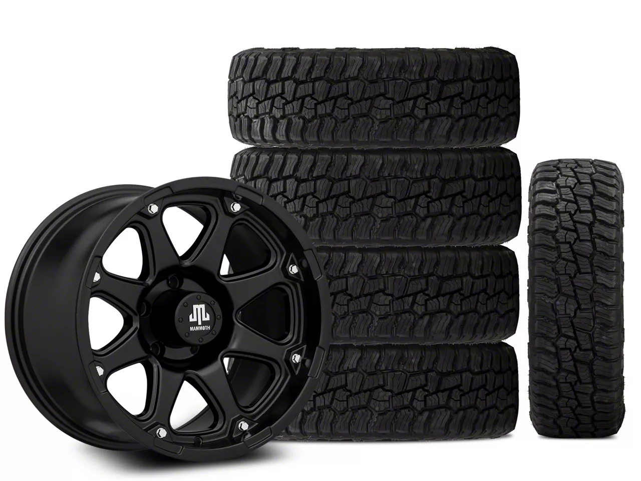 Mounted and Balanced Wheel and Tire Kit. This wheel and tire combo kit features (5) 17x9 Mammoth Wheelser Matte Black Wheels and (5) Mickey Thompson Baja Boss A/T 33" - 285/70R17 tires that have been put together into an easy to buy kit that arrives to your door already mounted and balanced ready to be installed on your vehicle.