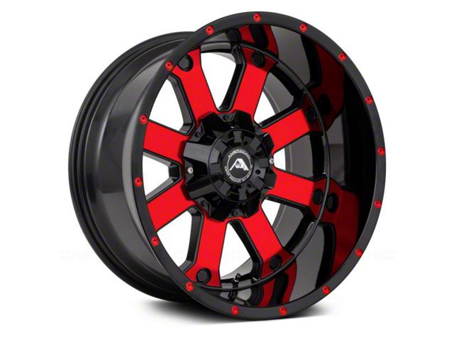 American Off-Road Wheels A108 Gloss Black Machined with Red Tint 6-Lug Wheel; 20x10; -24mm Offset exudes sophistication with its finish, offering a sleek and modern appeal to any vehicle it adorns. The design is meticulously crafted to enhance the aesthetic of your vehicle, giving it a distinctive and upscale look. Perfect for those seeking to elevate their vehicle's style, this wheel blends seamlessly with both contemporary and classic vehicle designs, making it a versatile choice for a wide range of vehicles. Its robust construction ensures durability, making it a reliable choice for drivers who value both style and quality.