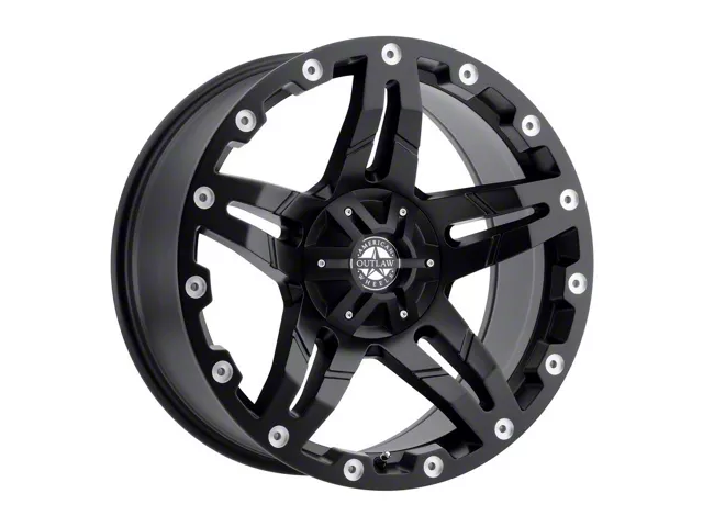 American Outlaw Wheels Revolver Satin Black Wheel; 17x8.5. The American Outlaw Wheels Revolver Satin Black Wheel offers a striking balance of style and refinement. Its unique design accentuates the vehicle's aesthetic, while the premium construction underscores its robust nature. This wheel is a perfect choice for those seeking both elegance and a strong visual statement.