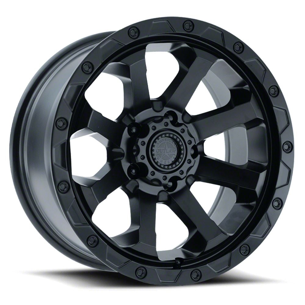 American Outlaw Wheels Capone Satin Black 6-Lug Wheel; 17x8.5; 0mm Offset exudes sophistication with its finish, offering a sleek and modern appeal to any vehicle it adorns. The design is meticulously crafted to enhance the aesthetic of your vehicle, giving it a distinctive and upscale look. Perfect for those seeking to elevate their vehicle's style, this wheel blends seamlessly with both contemporary and classic vehicle designs, making it a versatile choice for a wide range of vehicles. Its robust construction ensures durability, making it a reliable choice for drivers who value both style and quality.