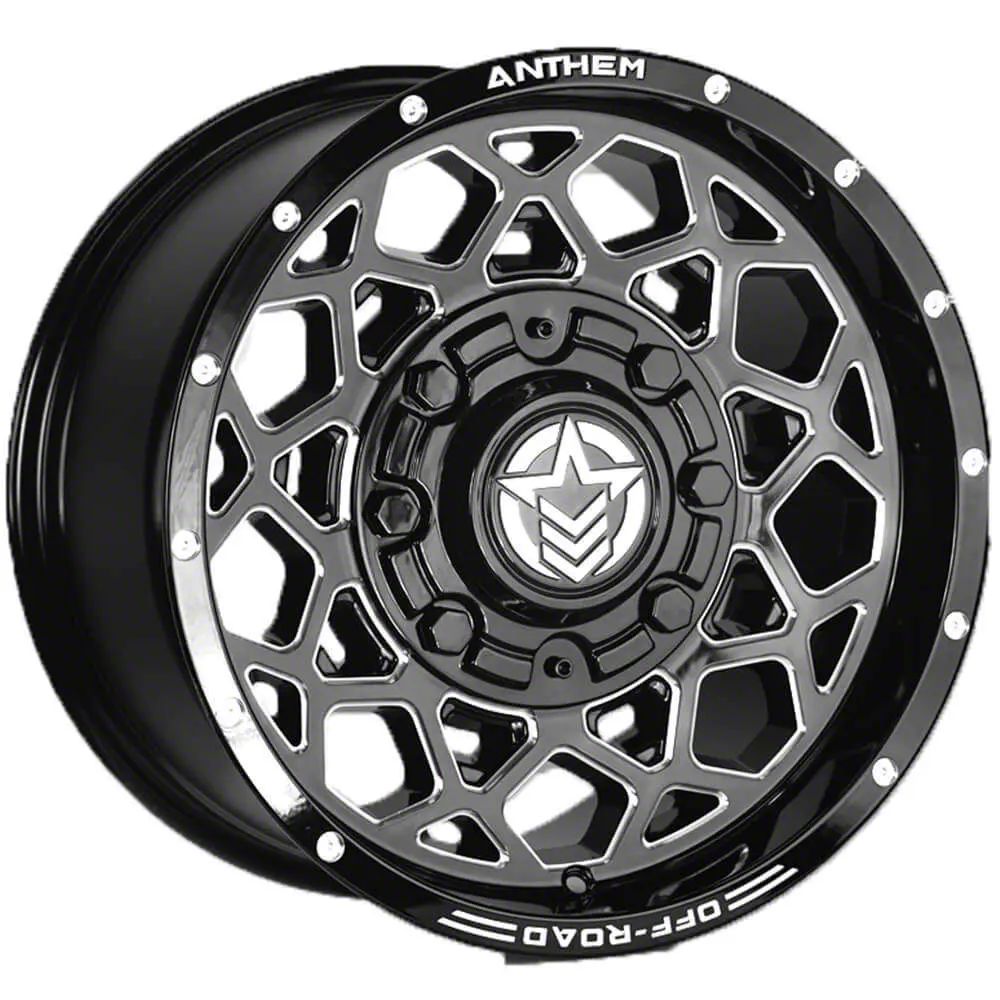 Anthem Off-Road Avenger Gloss Black Milled Wheel; 17x9. The Anthem Off-Road Avenger Gloss Black Milled Wheel offers a striking balance of style and refinement. Its unique design accentuates the vehicle's aesthetic, while the premium construction underscores its robust nature. This wheel is a perfect choice for those seeking both elegance and a strong visual statement.
