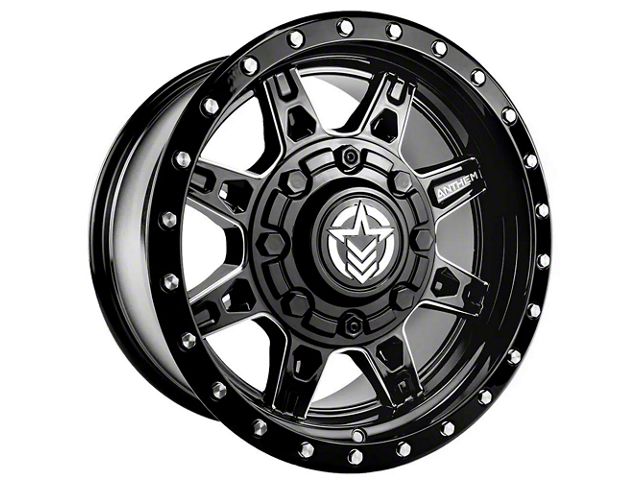 Anthem Off-Road Rogue Gloss Black Milled Wheel; 17x9. The Anthem Off-Road Rogue Gloss Black Milled Wheel offers a striking balance of style and refinement. Its unique design accentuates the vehicle's aesthetic, while the premium construction underscores its robust nature. This wheel is a perfect choice for those seeking both elegance and a strong visual statement.