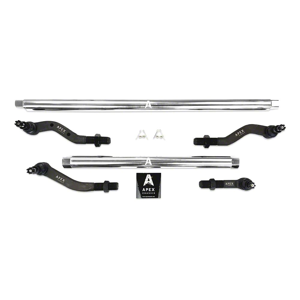 High Grade Quality. Introducing the Apex Chassis 2.5-Ton Tie Rod and Drag Link Assembly -- the driving force behind your vehicle straps. This assembly is crafted with quality materials like SAE 1045 solid steel and then CNC-machined for maximum strength. Its induction heat-treated ball studs, rolled threads, rugged metal to metal bearings, and greasable components make it a powerhouse you can count on when you hit flex course terrain.