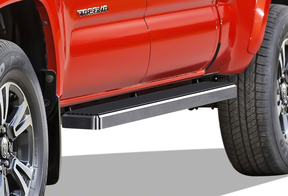 Sophisticated Finish Touch. You don’t have to endure the plain and flimsy factory side steps that come with your Tacoma. Replace them with a stylish pair of 5-Inch iStep Running Boards in Hairline Silver. These stainless steel running boards feature a low profile design that looks great with any truck. They provide a comfortable foothold for easier entry and exit, as well as some shielding from flying rocks and roadside debris.