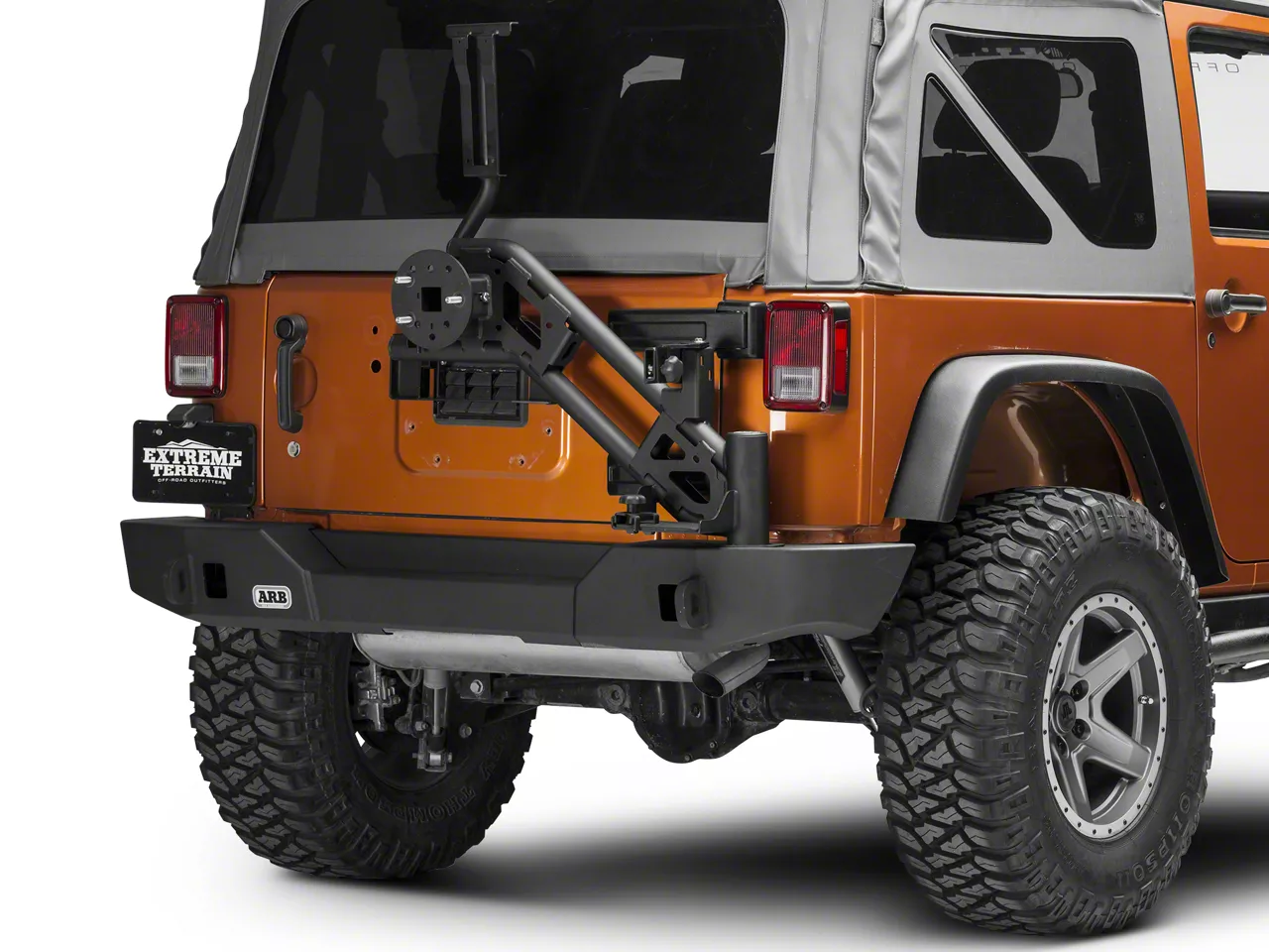 Extreme Construction. This bolt on Wrangler tire carrier is made from high quality materials and features a CNC machined pivot with built in bronze bushings. This bumper is complete with a urethane packer to reduce movement and ensure noise free performance on and off road. The entire carrier is finished in ARB's durable Integrit black powder coat which features an integrated synthetic wax to provide self cleaning properties.