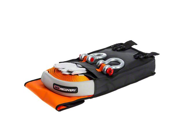 Construction and Appearance. This recovery kit features a rugged matte black and hazard orange finish, making it highly visible and durable. The outer shell is built from 600gsm PVC, offering excellent resistance to wear and tear. Inside, you'll find a 17,600-pound snatch strap, two galvanized 4.75-ton rated shackles, recovery gloves, and a recovery bag. Dual compartments fit an ARB recovery damper (ARB220), and the rubber carry handle ensures easy transport.