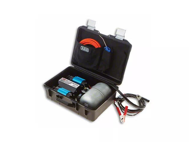 Rapid Inflation. Inflate your tires like a true off-roading professional using the high-performance ARB Twin High Performance 12 Volt Portable Air Compressor, designed for both commercial and industrial applications. It features a compact dual cylinder, twin-motor running at 6.16 CFM and 0 PSI with a strong pressure regulation aluminum tank, excellent for small to large tires on your Jeep Wrangler.