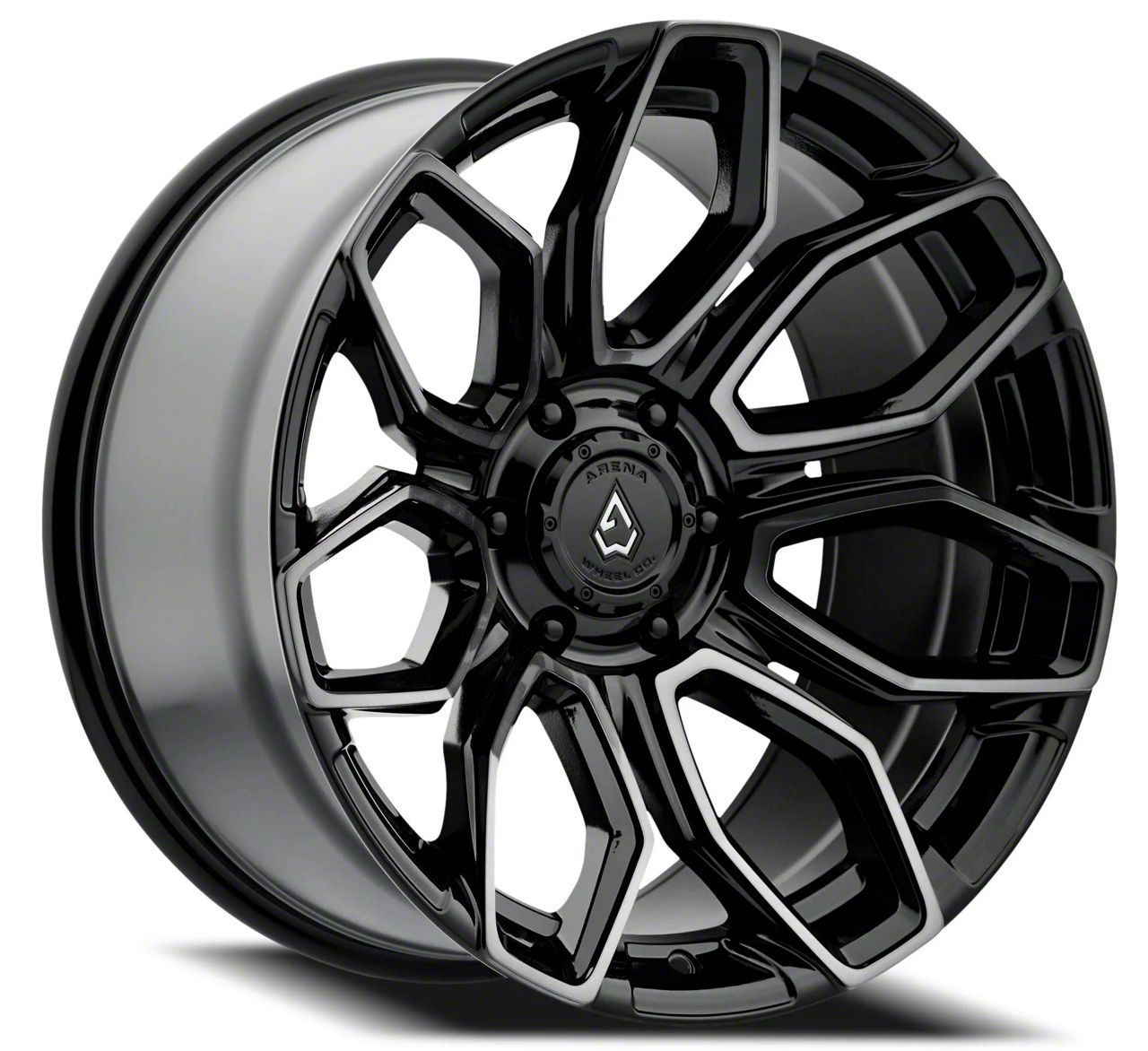 Arena Cobra Glossy Black with Brushed DDT Face Clear Wheel; 22x10; 15mm Offset Its deep gloss black finish delivers a sleek, aggressive look that complements the lines of any truck. The Cobra Glossy upholds Arena's reputation for delivering wheels that balance visual impact with reliable build quality. Whether you're on the job site or out on the trail, this wheel is built to look great and hold up to the demands of your lifestyle.