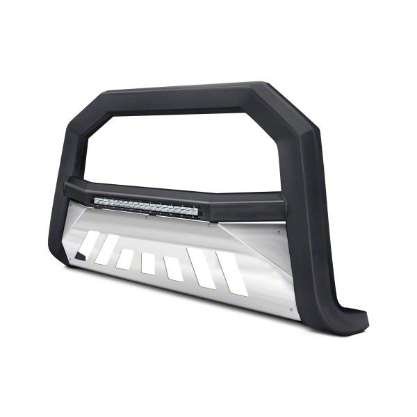 Lit Up Additional Protection. Designed with a compatible aluminum skid plate and an integrated LED light bar, this bull bar is a great upgrade for those that need an additional layer of protection for their daily driver.