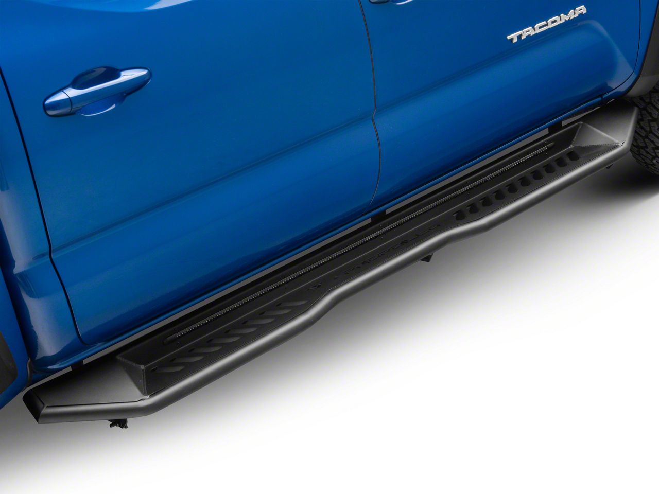Step Support. Elevate the look of your ride and get in more comfortably with this Armordillo FX Running Boards with LED Lights; Matte Black on your Tacoma. Sporting a rugged design and built-in LEDs, it is useful for use in dark road conditions to scale your tall vehicle.