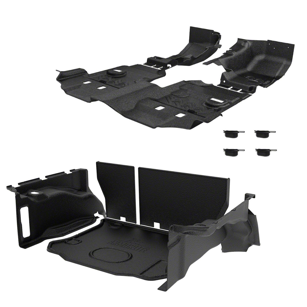 Complete replacement front and rear flooring system for 2007-10 Jeep® Wrangler JKU (4Dr) models. Easy to install, easy to clean, reduces cabin heat and noise, and tougher than any floor on the trail for scratch and mar resistance.
