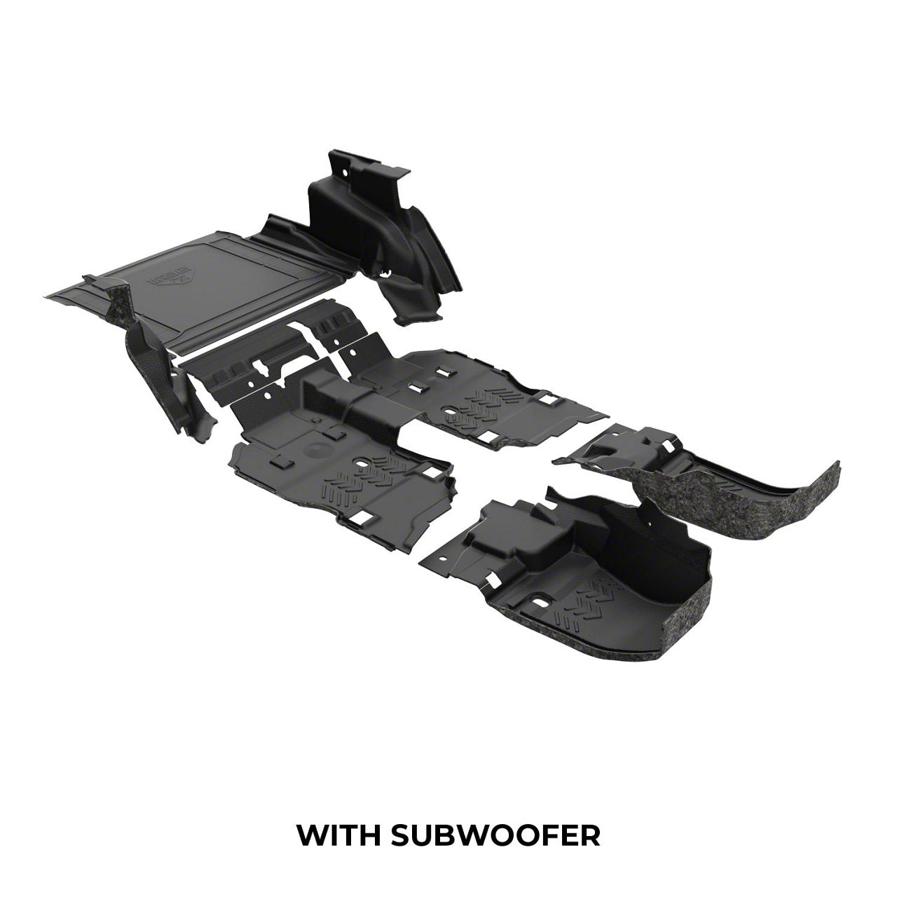 Complete replacement front and rear flooring system for 2018-2023 Jeep® Wrangler JLU (4Dr) models. Easy to install, easy to clean, reduces cabin heat and noise, and tougher than any floor on the trail for scratch and mar resistance.