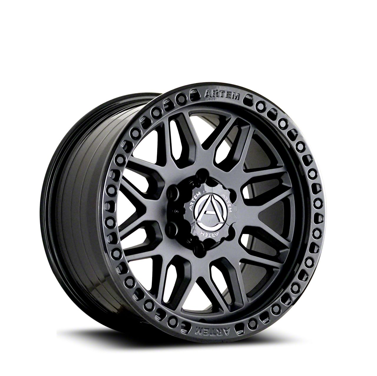 Artem GRIMLOCK Satin Black Face with Gloss Black Ring Wheel; 17x9; -12mm Offset This wheel brings a commanding presence with its distinct design, making it a bold choice for enthusiasts looking to upgrade their vehicle’s look. The premium finish and attention to detail reflect the high standards of Artem, giving any vehicle a modern and aggressive edge. Its styling pairs seamlessly with rugged builds or sleek street setups alike, elevating curb appeal with ease.