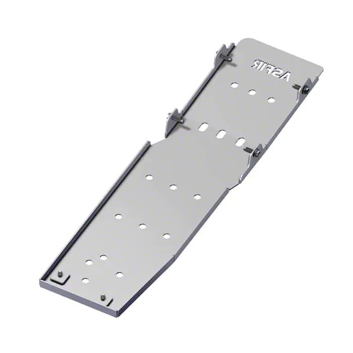 Construction and Appearance. Crafted from high-grade 1/8" (3.17 mm) laser-cut aluminum, this skid plate balances optimal strength with minimal weight at just 9 pounds. Its design includes integrated stiffening ribs for enhanced durability and is mounted on corrosion-resistant zinc-coated steel brackets. The unit features ventilation slots and drain holes to reduce heat buildup and prevent debris accumulation.
