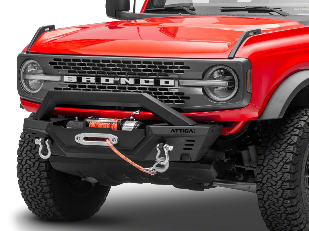 Modern Front-End Styling. Upgrade your Bronco with the Attica 4x4 Terra Series Modular Front Bumper; Textured Black. Engineered for off-road enthusiasts, this front bumper combines rugged durability with modular versatility, providing enhanced protection and a customizable look for your vehicle. With its modular design, this front bumper allows you to customize your Bronco to suit your specific needs. The bumper features integrated D-ring mounts, providing convenient recovery points for your off-road adventures. It also includes a winch plate that accommodates most popular winches, giving you the capability to tackle even the most challenging terrains.