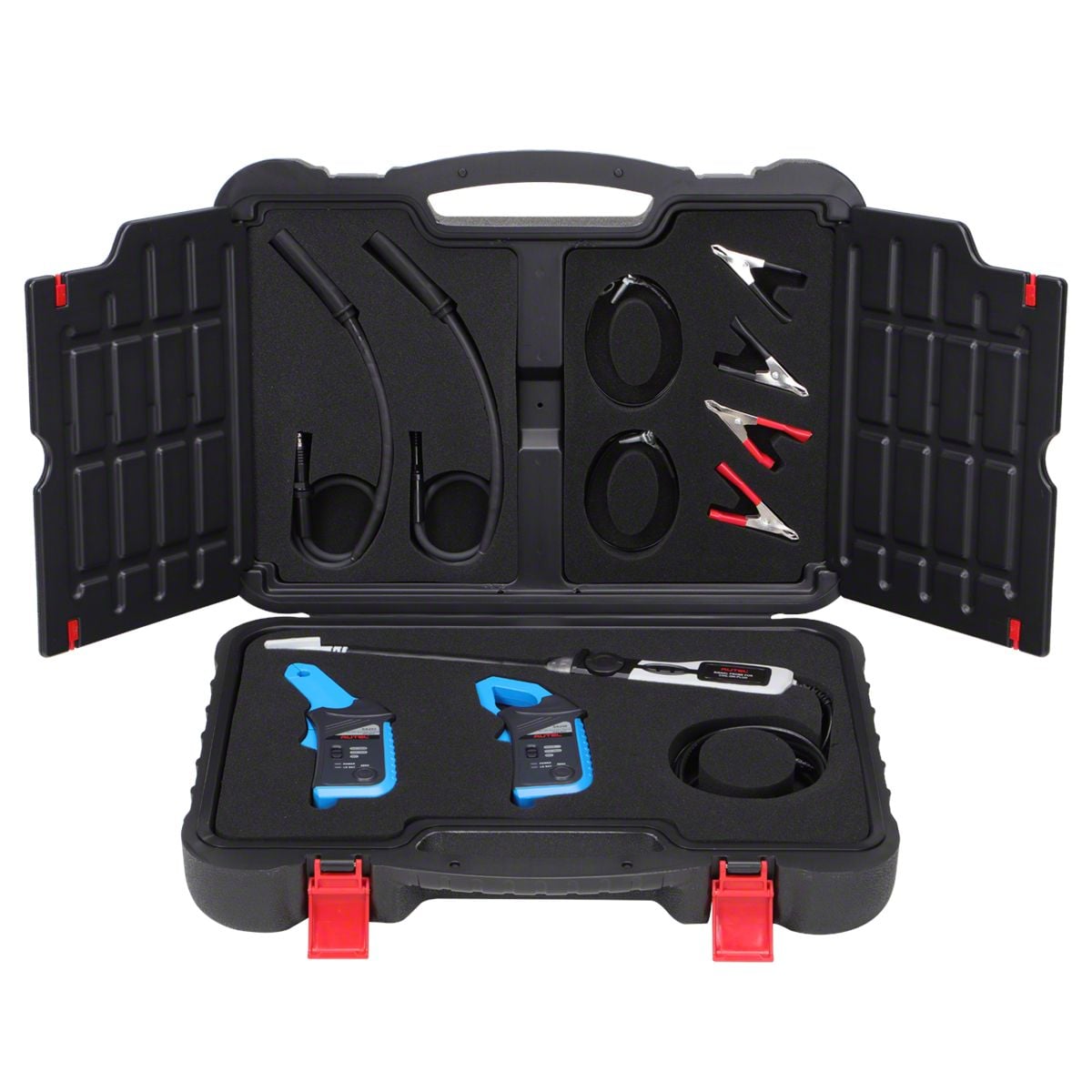 • The MSOAK, compatible with the MaxiFlash VCMI included with the MSUltra and MS919, and the MP408 4-channel oscilloscope (sold separately), includes the 65A AC/DC Current Clamp, 650A AC/DC Current Clamp, Coil On Plug Probe, HT Extension Lead (2pcs) and Battery Clip (2pcs), within a blow-molded carrying case.