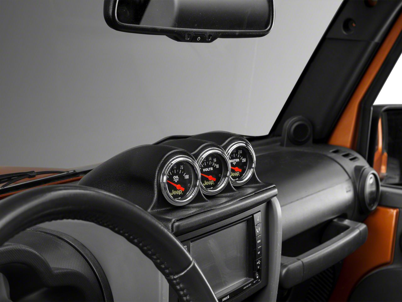 Overview. This gauge pod is perfect for any off-road fanatic looking for a way to tackle the rough treatment off-road rides throw at their dashboards. Designed to match both the color and style of your car’s interiors, the Auto Meter Dash Top Gauge Pod should cozily fit onto the dash of any 07 -10 Wrangler JK Jeep model.