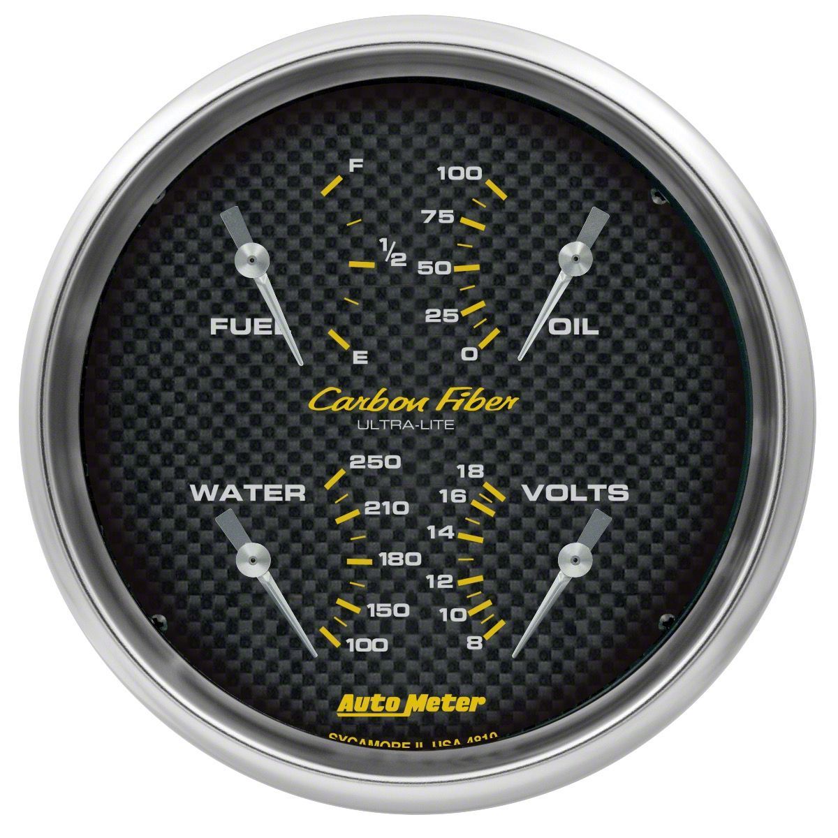 Auto Meter Carbon Fiber Series 5-Inch Quad Gauge; 240 ohm Empty to 33 ohm Full (Universal; Some Adaptation May Be Required)
