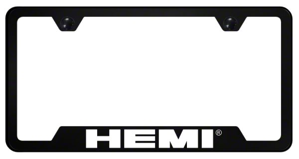 Description. Notched frame design featuring a wide bottom with gracefully notched corners. Exceptional in quality, design and value, these Black UV printed polycarbonate license frames are manufactured using excellent materials and workmanship. Includes matching black theft deterrent caps to conceal unsightly hardware. Proudly manufactured in the USA and backed by a lifetime warranty against flaws in materials or workmanship. Product dimensions: 6.25 Inches (Height) x 12.25 Inches (Width).