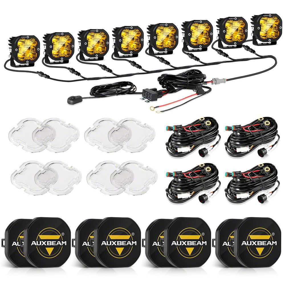 Application. This Auxbeam XP-ULTRA Series 3-Inch LED Pod Lights with 8-Pod Wiring Harness and Black Covers (Amber/White Spot Beam, Set of 8) offers universal fitment.