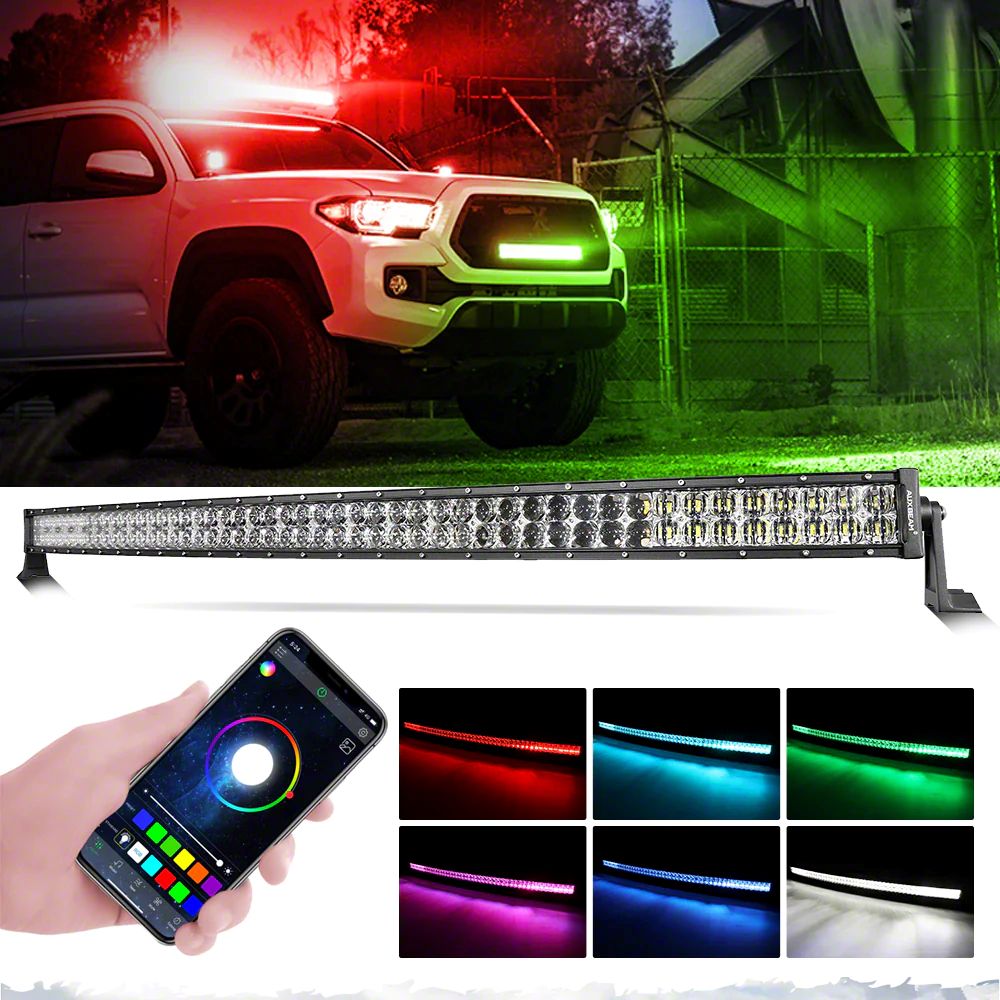 Multi Mode. Made for a universal fit, this Auxbeam V-Series LED Light Bar comes with a matte black finish aluminum housing and a clear polycarbonate lens. A curved 52 inch model, this light bar has RGB+White LED light output and uses 180 watts of power at 12 volts. Equipped for beam and flood combo modes, this light bar is IP68 water and dustproof with a rated lifespan of 50,000 hours.