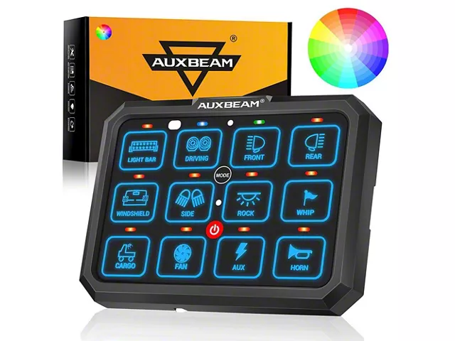 Cutting-Edge Multiple Control Solution. The Auxbeam RB120 Series RGB 12-Gang Multifunction Switch Panel is a cutting-edge solution for controlling multiple electrical components in your vehicle. Designed for off-road, overlanding, and custom builds, this panel supports up to 12 devices and offers seamless control via physical buttons, a mobile app, or a remote. It's ideal for those looking to streamline and enhance their vehicle's accessory management system.
