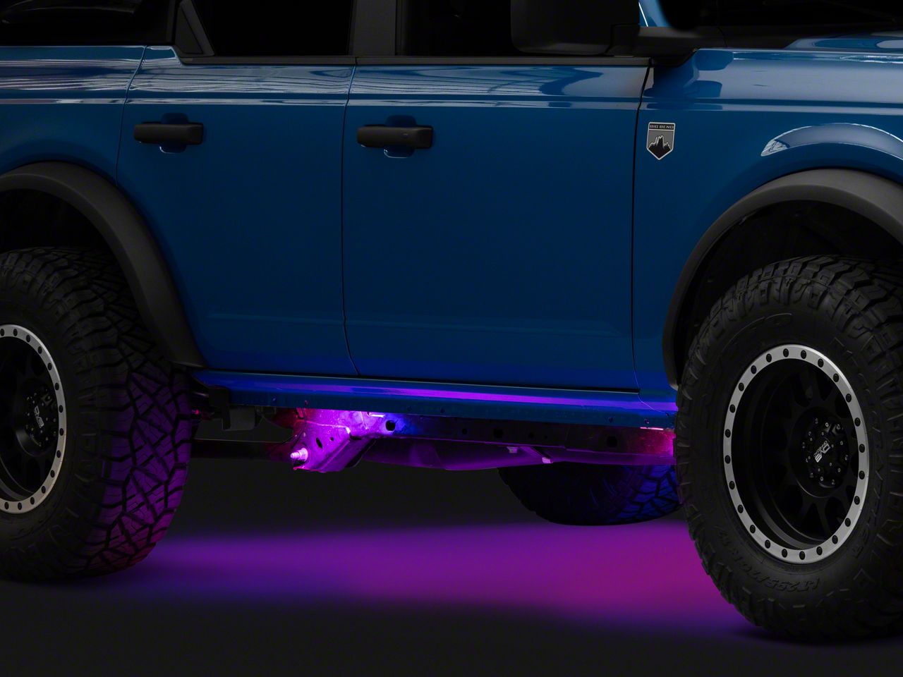 Custom Rock Lighting. Negotiating trails and rocks at night, or in poor weather conditions, can be very challenging. However, by installing an Axial Bluetooth Multi-Color Underbody Rock Light Kit you will be able to light up your wheel wells and undercarriage allowing for better visibility of the situation. This Underbody Rock Light Kit not only aids in off-road excrusions, but it also adds unique custom lighting effects to your vehicles exterior. Lighting options include a full array of colors, as well as strobe, pulsating and a solid modes.