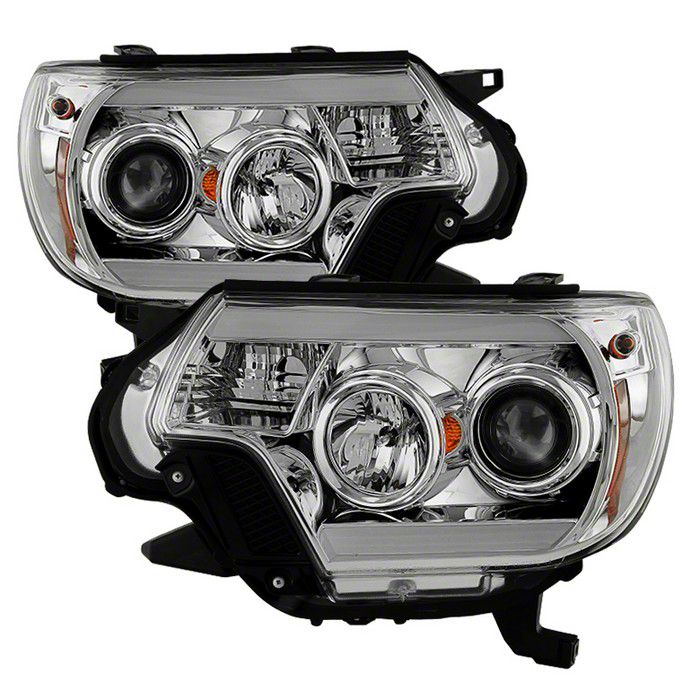 Increases Visibility with Low and High Beams. Whether you use your Toyota Tacoma for your daily commute or reserve it for your off-road adventures, you will appreciate the replacement of your factory headlights with these Chrome Projector Headlights with Daytime Running Light. In addition to the more aggressive styling that your truck will get with the clear lenses and chrome-finished housing, this pair of halogen headlights consists of low beams to make it easier to spot oncoming vehicles and high beams to increase your seeing distance. Ultimately, these lights will always ensure a safe, secure drive.