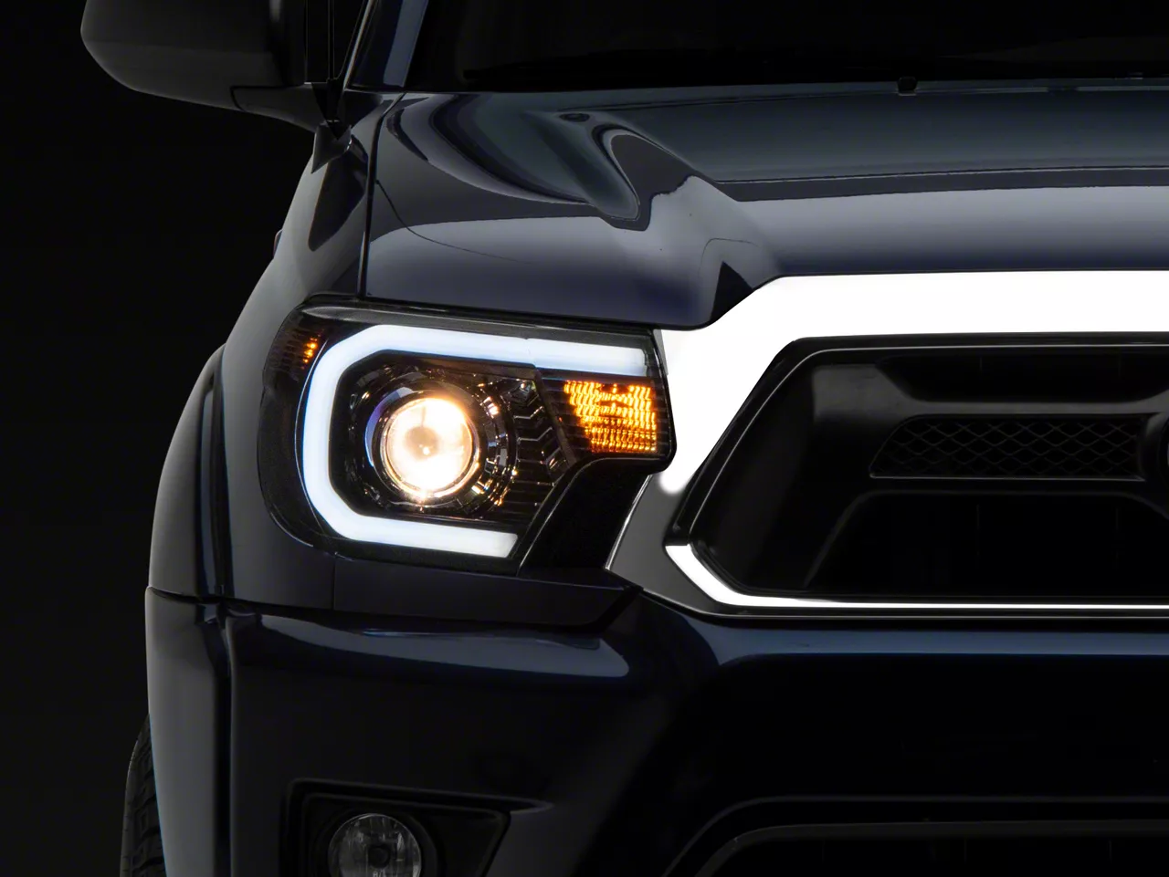 Contemporary Styling. Add an updated contemporary appearance to your 2012-2015 Toyota Tacoma, all while improving your nighttime visibility with a pair of Axial LED Projector Headlights that feature black housings and clear lenses. With an impressive LED Daytime Running Light (DRL) design, these Headlights will give your Tacoma a whole new look.