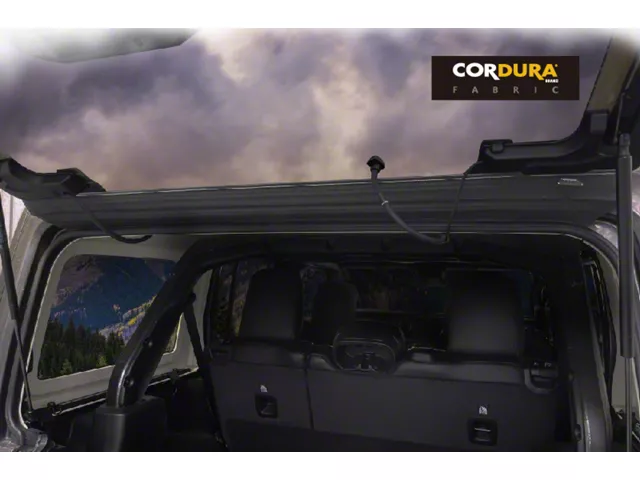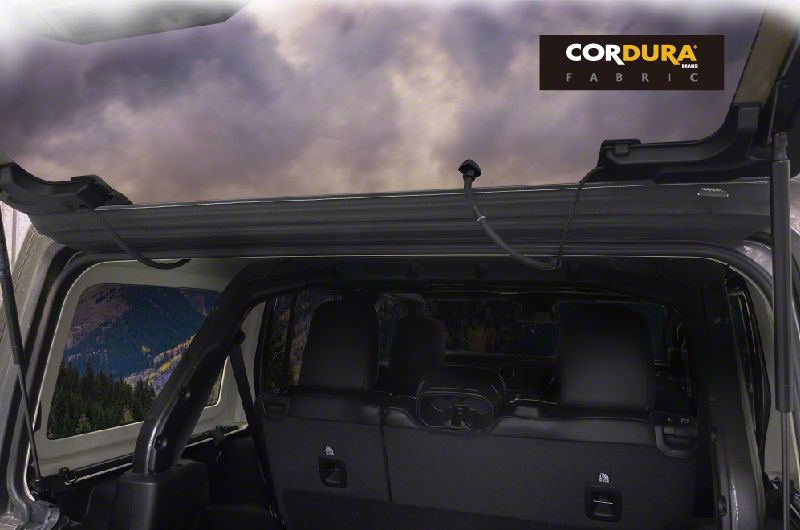 Construction and Appearance. Crafted from ultra-lightweight materials and finished in black fabric, the deflector maintains a clean, low-profile appearance that complements the Wrangler's rugged styling. Its custom contour ensures a tight fit on factory hard tops while delivering a soft, refined look that integrates seamlessly with the vehicle's rear glass line.