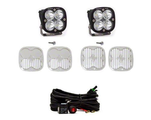 Superior Lighting Solution. This Baja Designs A-pillar Lighting Kit includes a pair of Squadron Sport LED auxiliary light cubes in a spot beam configuration. A set of driving/combo and wide cornering lenses in the event you would like to change the pattern for better visibility. The accessories included in this kit are a relay style harness with toggle switch, and hardware. The installation process of this kit is extremely simple and does not require any cutting or drilling.