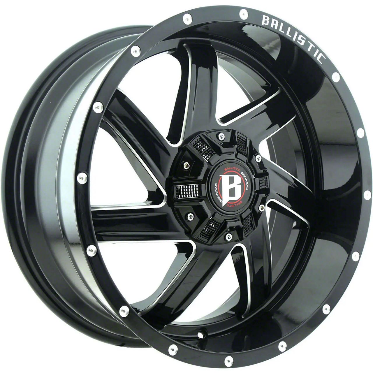 This 17x9 Ballistic Guillotine Gloss Black Milled 6-Lug Wheel is completed in a high-quality gloss black finish with steel milled accents that will create a striking appearance. There's a durable clear coat that protects against driving hazards.