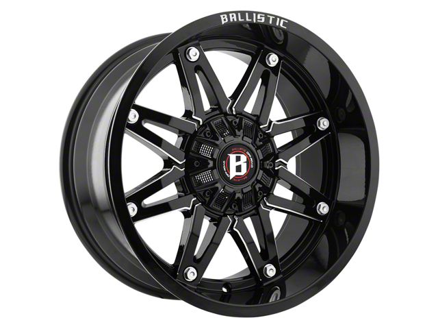 Ballistic Gladiator Gloss Black Milled Wheel; 20x10. The Ballistic Gladiator Gloss Black Milled Wheel offers a striking balance of style and refinement. Its unique design accentuates the vehicle's aesthetic, while the premium construction underscores its robust nature. This wheel is a perfect choice for those seeking both elegance and a strong visual statement.
