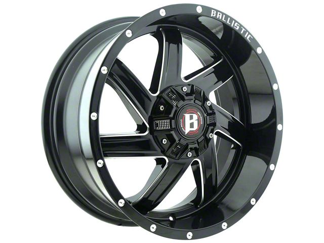 Ballistic Guillotine Gloss Black Milled Wheel; 18x9. The Ballistic Guillotine Gloss Black Milled Wheel offers a striking balance of style and refinement. Its unique design accentuates the vehicle's aesthetic, while the premium construction underscores its robust nature. This wheel is a perfect choice for those seeking both elegance and a strong visual statement.