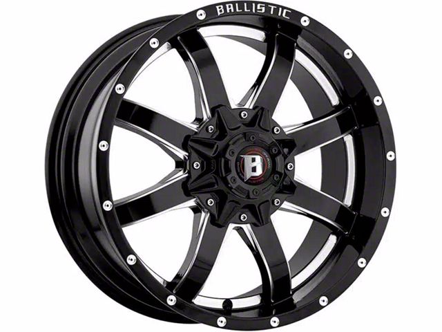 Ballistic Anvil Gloss Black Milled Wheel; 17x9. The Ballistic Anvil Gloss Black Milled Wheel offers a striking balance of style and refinement. Its unique design accentuates the vehicle's aesthetic, while the premium construction underscores its robust nature. This wheel is a perfect choice for those seeking both elegance and a strong visual statement.