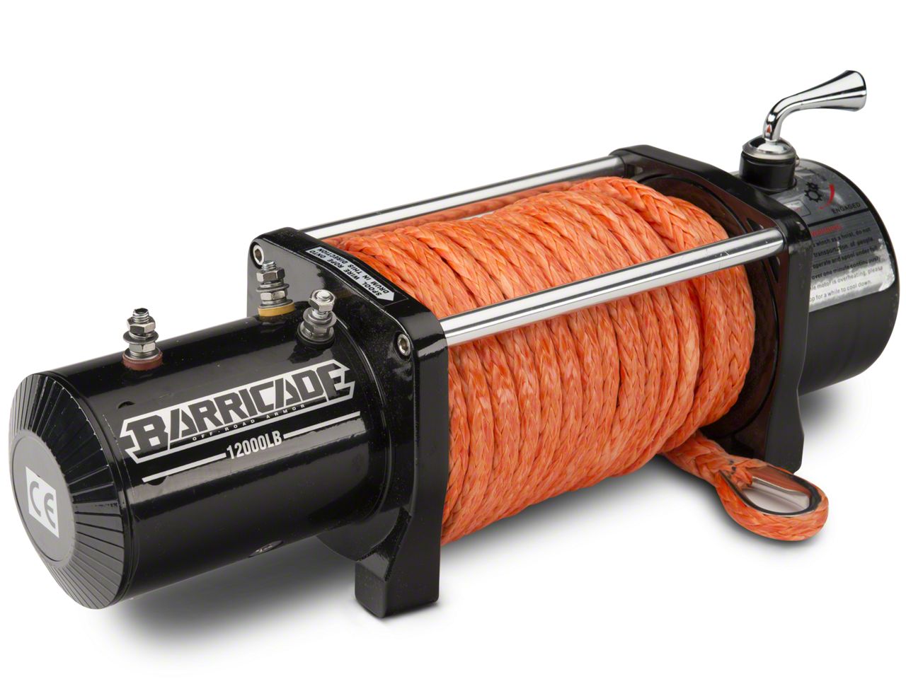 Heavy Duty Winch. The Barricade Off-Road 12000lb Winch is driven by a powerful 6.6 HP series-wound 12-volt electric motor and features a rugged 3-stage planetary gear box with a 187.2:1 gear ratio to provide 12000lbs of pulling power to get you out of the messiest situations.