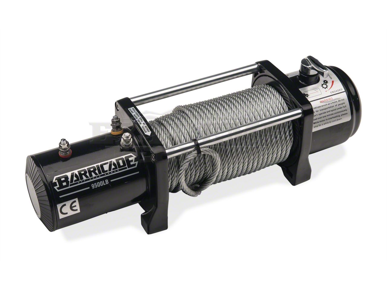 Heavy Duty 9500 LB Winch. This Barricade Off-Road Winch is driven by a powerful 5.5 HP series-wound 12-volt electric motor and features a rugged 3-stage planetary gear box with a 195.4:1 gear ratio to provide 9500 lbs of pulling power. Matched with a sliding ring gear clutch and a two-way automatic, in-the-drum braking system, you know you can always rely on this winch to hold your rig.