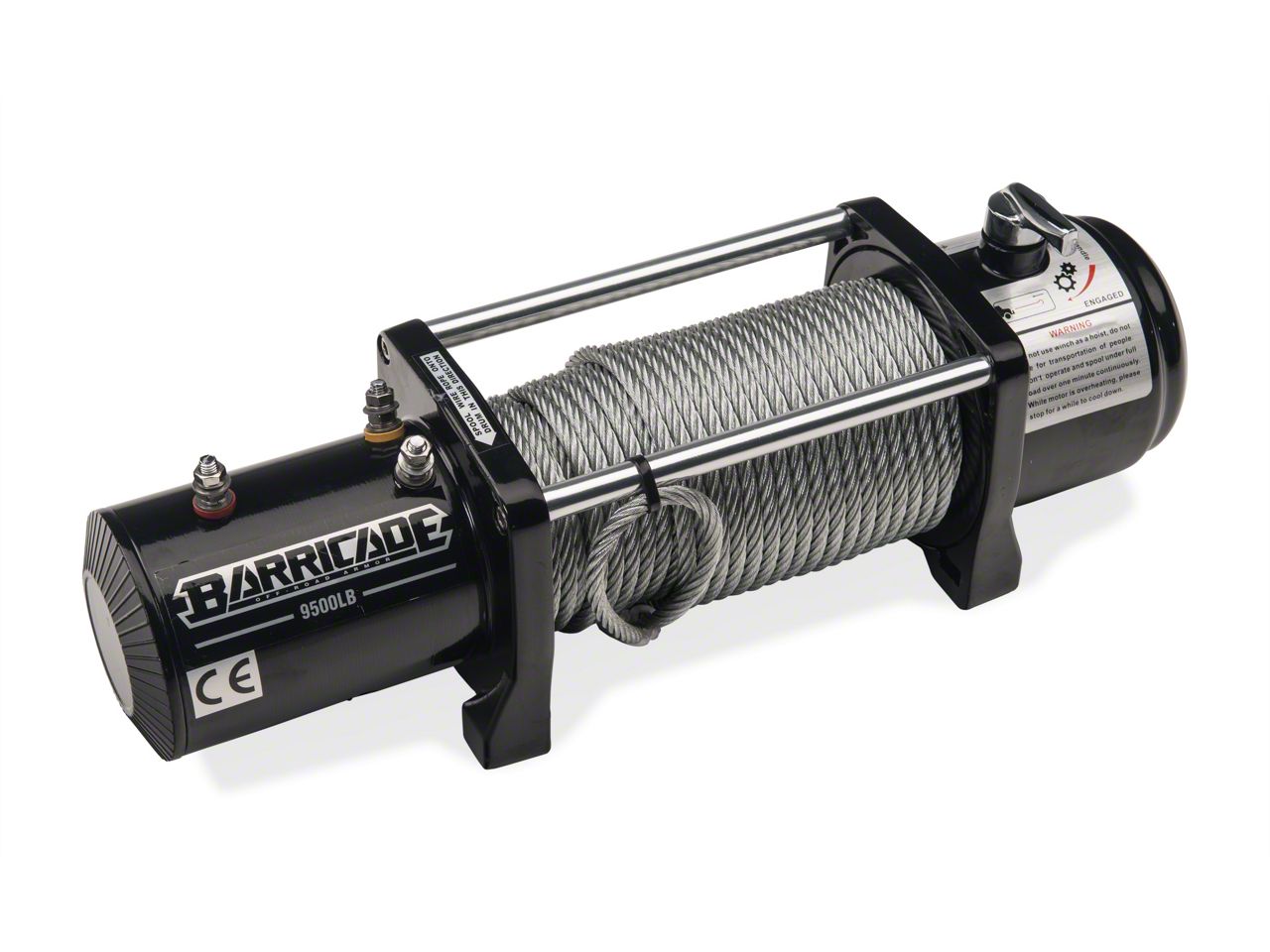 Pulling Capacity. Barricade Off-Road's 9500 lb winch is essential for any off-roader whether you're on easy romp through the woods or a competition course. This winch provides reliable pulling power for when you and your Jeep find yourselves stuck. Its 5.5hp, 12-volt motor with a gear ratio of 195.4:1 can recover your Jeep from the deepest mud or biggest rock jam.
