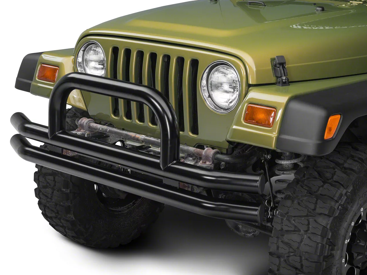 Classic Off-Road Styling. Add retro off-road styling to your Jeep with a Barricade Off-Road gloss black double tube front bumper that features a classic straight hoop over-rider. Barricade Off-Roads Double Tubular Front Bumpers not only look great, but provide additional protection from brush and other trail hazards.