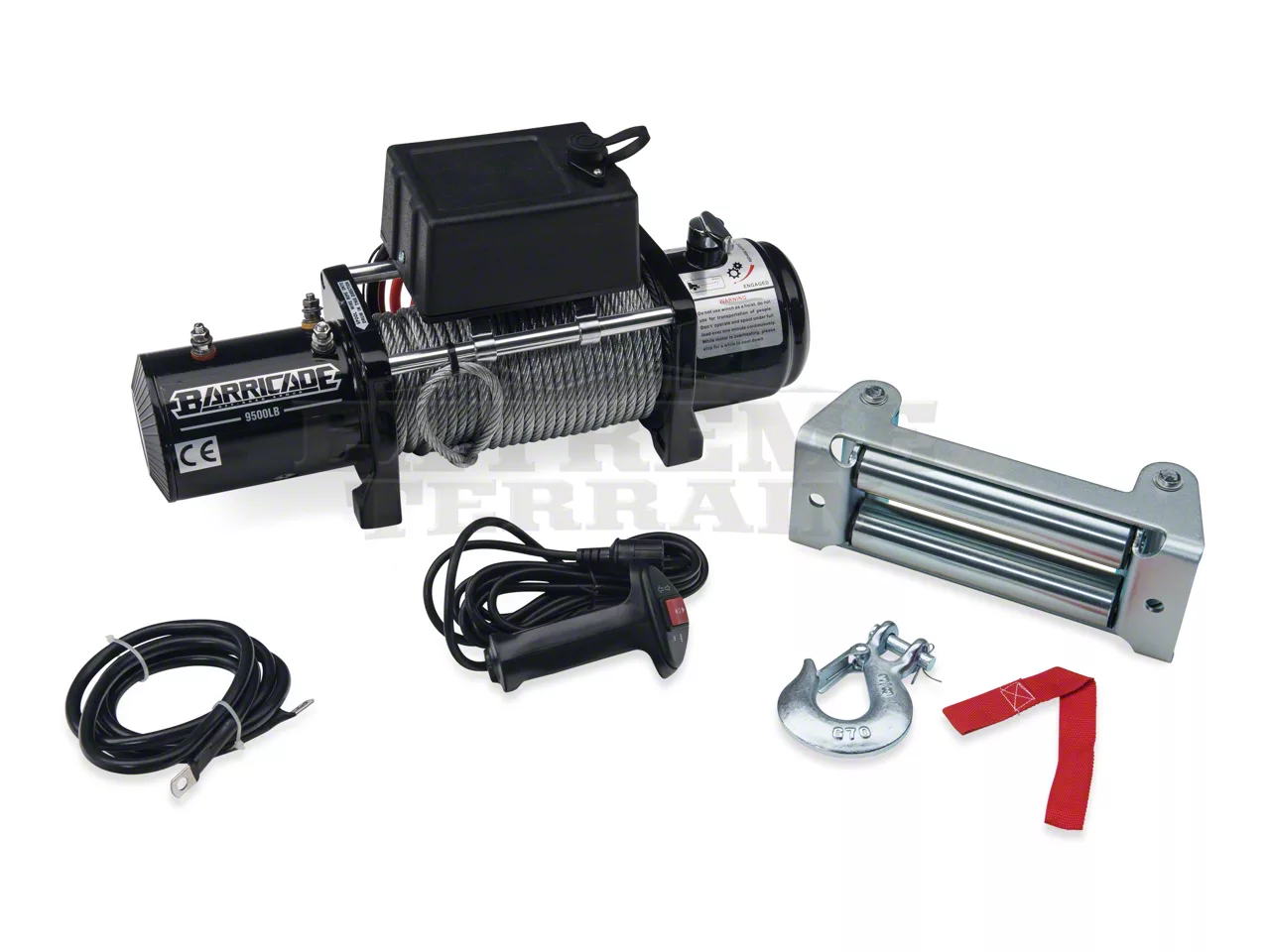 Pulling Capacity. Barricade Off-Road's 9500 Pound Winch is essential for any off-roader whether you're on easy romp through the woods or a competition course. This winch provides reliable pulling power for when you and your Jeep find yourselves stuck. Its 5.5hp, 12-volt motor with a gear ratio of 195.4:1 can recover your Jeep from the deepest mud or biggest rock jam.