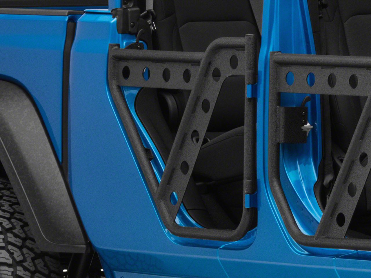 Exciting Safari Styling. A great way to add exciting safari styling to your Jeep Gladiator JT is with a pair of Barricade's Rear Extreme HD Adventure Doors. These tubular Adventure Doors not only look great, but they help to increase your field of view, which is a great plus when trying to negotiate tricky terrain. Besides helping to increase visibility, these Tubular Rear Doors will provide a safe open air driving experience that driving without your JT's doors simply can't offer.