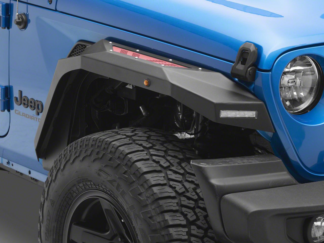 Application. These Barricade X-Series Front Fender Flares with LED DRL and Marker Lights; Red Inserts are designed to fit 2020-2026 Jeep Gladiator JT models. Driver and passenger side included.