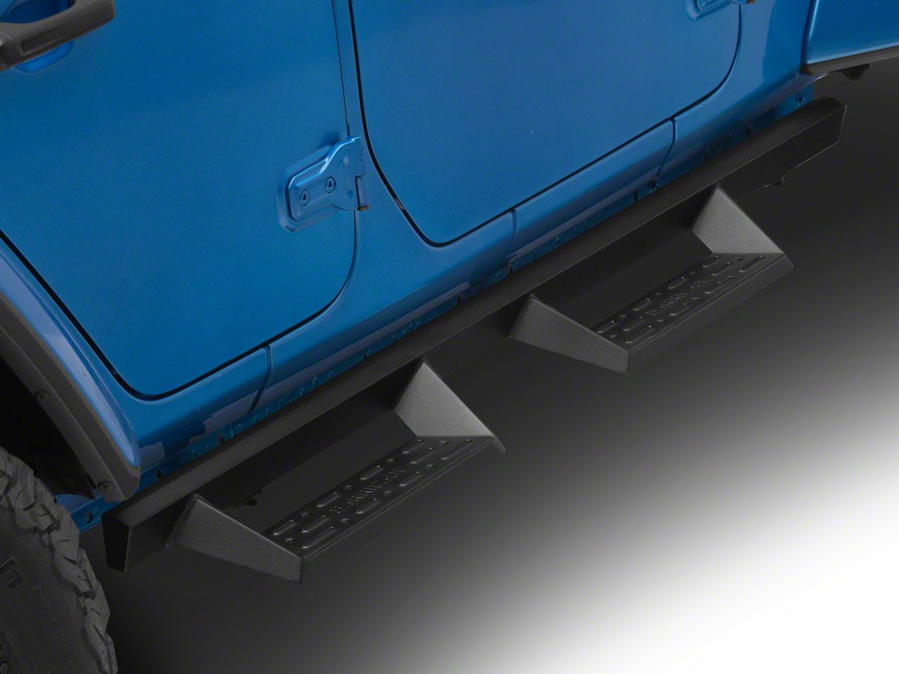 Style and Function. Make getting in and out of your 2018-2026 Jeep Wrangler JL much easier by installing a set of Barricade's Canyon Drop Steps. With an angular drop stepped design, these Side Steps not only provide easy entry, but they also give your rig a rugged off-road appearance. As an added bonus, these Canyon Drop Steps can provide additional protection from both road and trail hazards.
