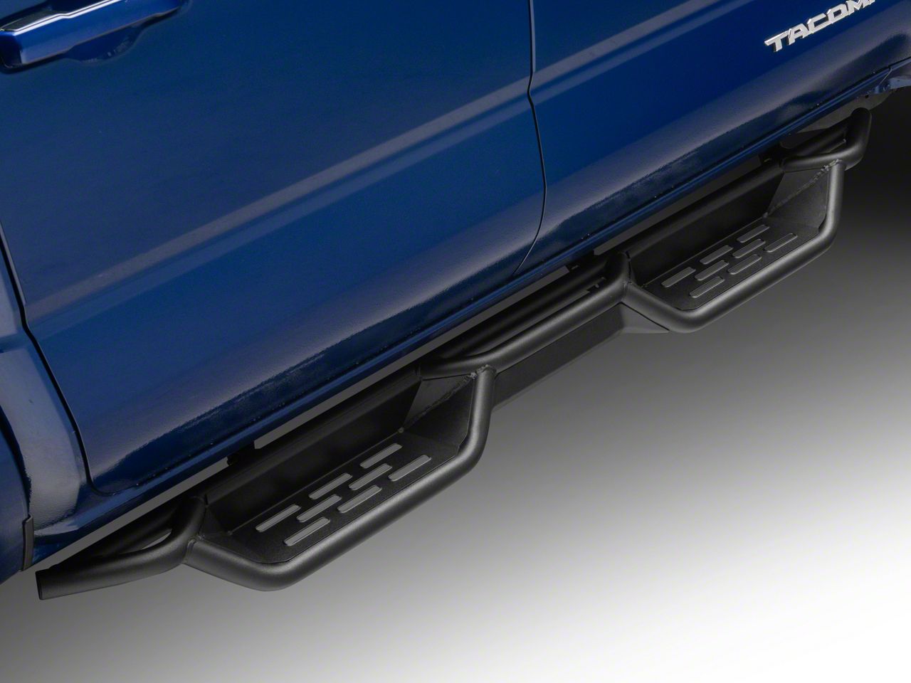 Rugged Style and Function. A set of Barricade's NB1 Drop Side Step Running Boards are an ideal way to make getting in and out of your Double Cab Tacoma a much easier task. With an angular drop stepped design, these black textured Side Steps not only provide easy entry into your Tacoma, but they will also give it a rugged off-road appearance. As an added bonus, these NB1 Drop Side Step Running Boards provide additional protection from both road and trail hazards.