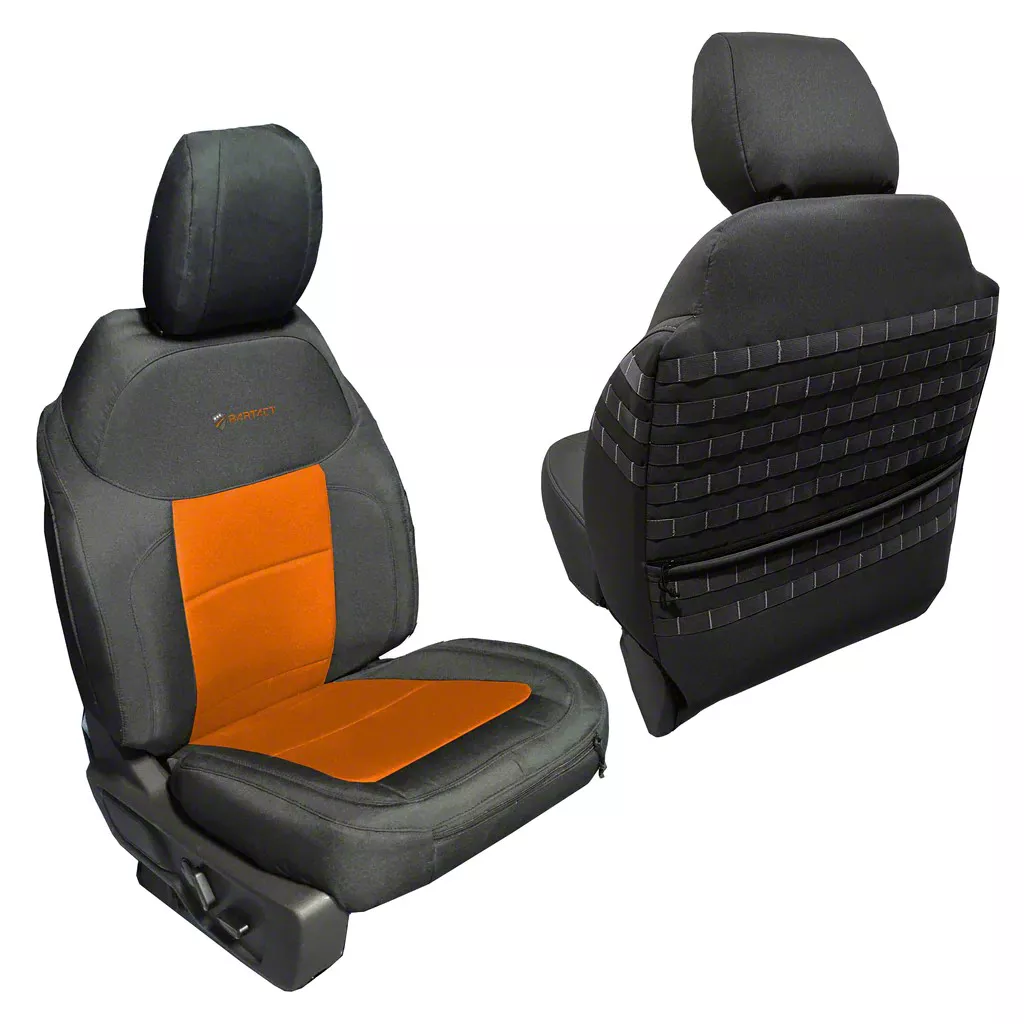 PALS/MOLLE-Compatible Covers. If you’re not a fan of the seat cover your new Bronco arrived with, the Bartact Tactical Front Seat Covers in Black/Orange got you covered. This pair of front seat covers are snug-fitting covers that feature Military Specifications PALS/MOLLE configuration on the backs, inside uppers, and outer lower of your Bronco seats to allow compatibility with the standard-issue MOLLE pouches and gear. It also has full-zippered front and rear pockets.